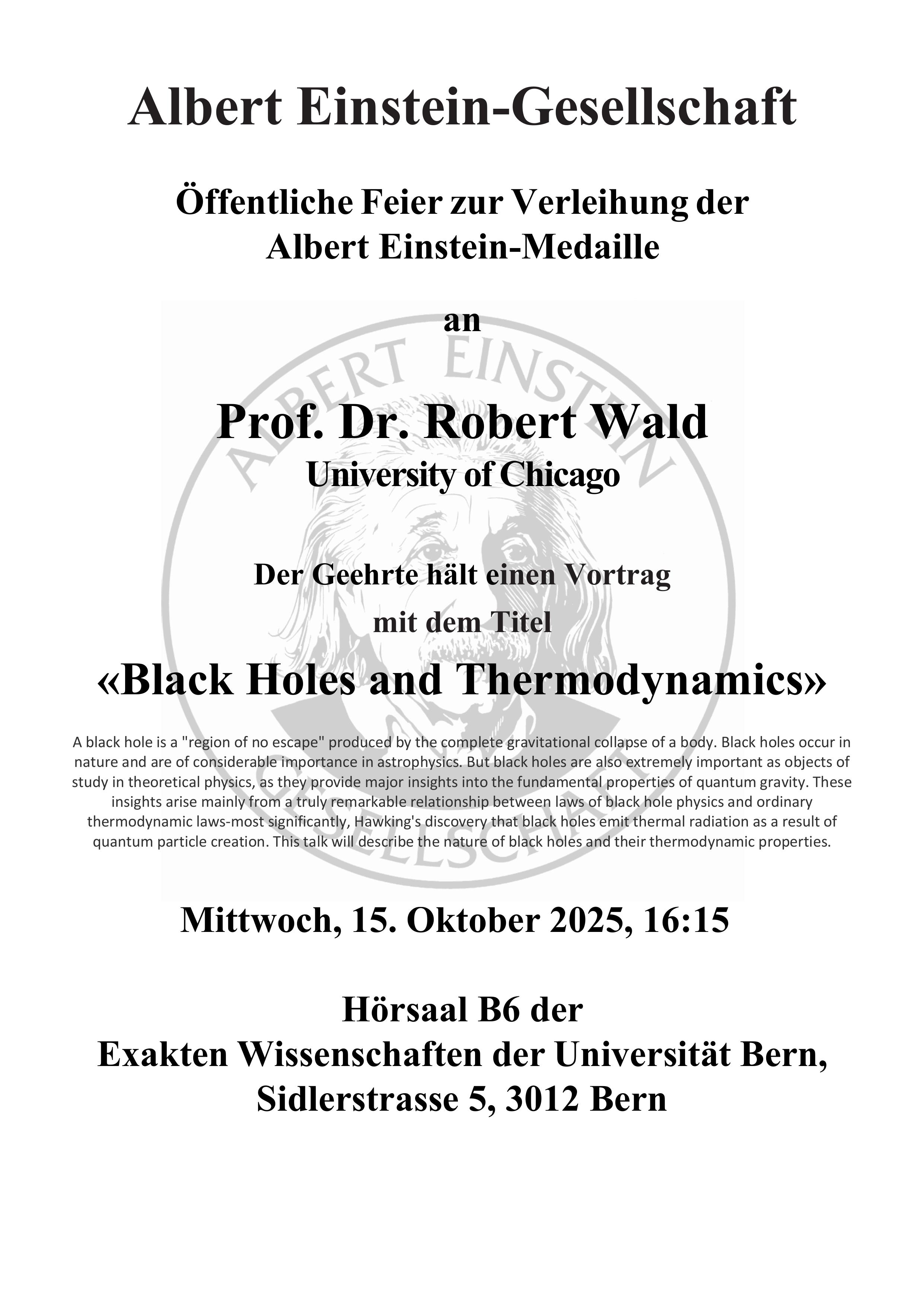 Award of the Albert-Einstein-Medal 2025 to Prof. Robert Wald, Univ. of Chicago on 15 October 2025 at the University of Berne.
